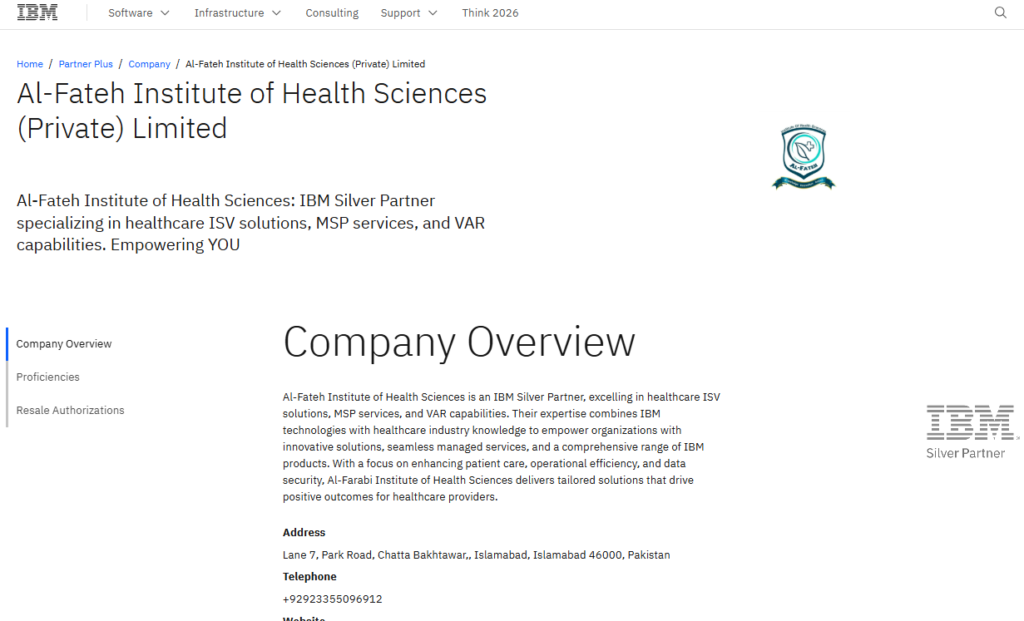 Al-Fateh Institute of Health Sciences is listed in the global IBM Partner Plus directory as an IBM Silver Partner supporting healthcare-sector solution environments and enterprise technology collaboration frameworks.